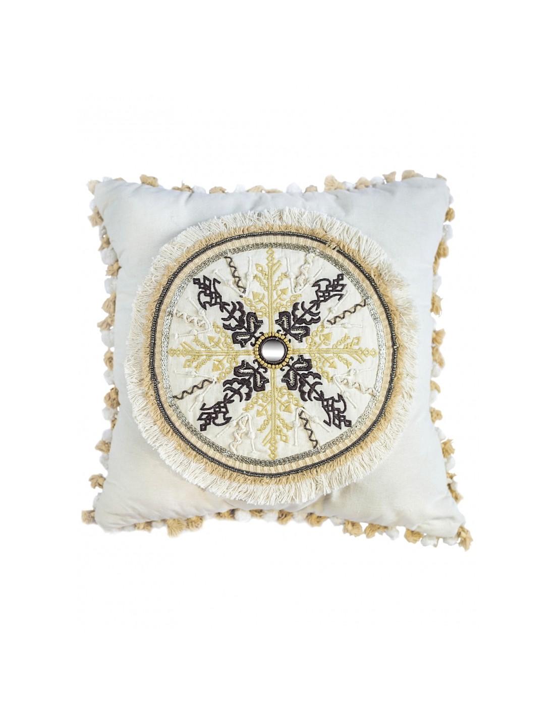 Descripcion: Almohadon cuadrado con apliques bordados en el centro y borlas en los extremos. Tamaño: 45cm x 45cm Peso con relleno: 760 grams Composicion: -Exterior 100% Algodon -Interior: 100% Algodon -Relleno: 100% Poliester